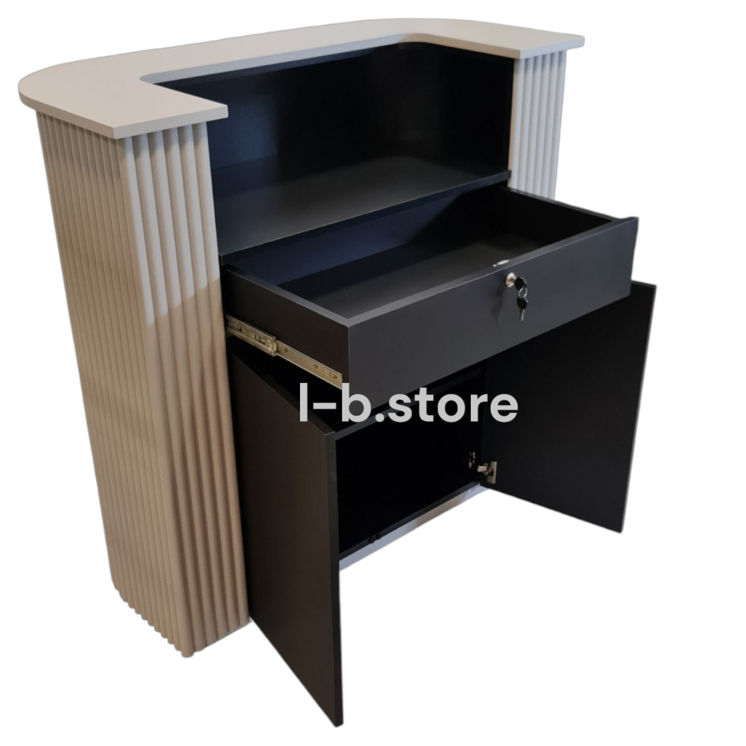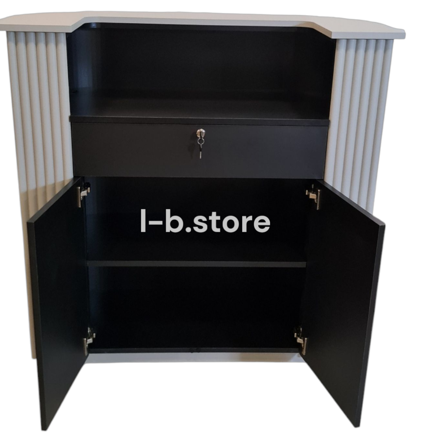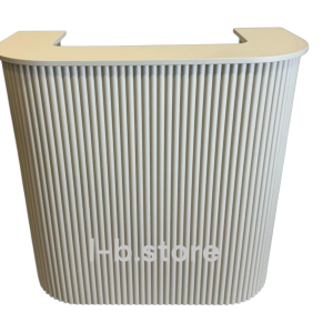 2. Wersja zabudowana – posiada dwie zamykane szafki do samego dołu, co zapewnia więcej przestrzeni do przechowywania, ale eliminuje możliwość siedzenia przy recepcji. To idealne rozwiązanie do miejsc, gdzie recepcja służy głównie do obsługi klientów w pozycji stojącej.