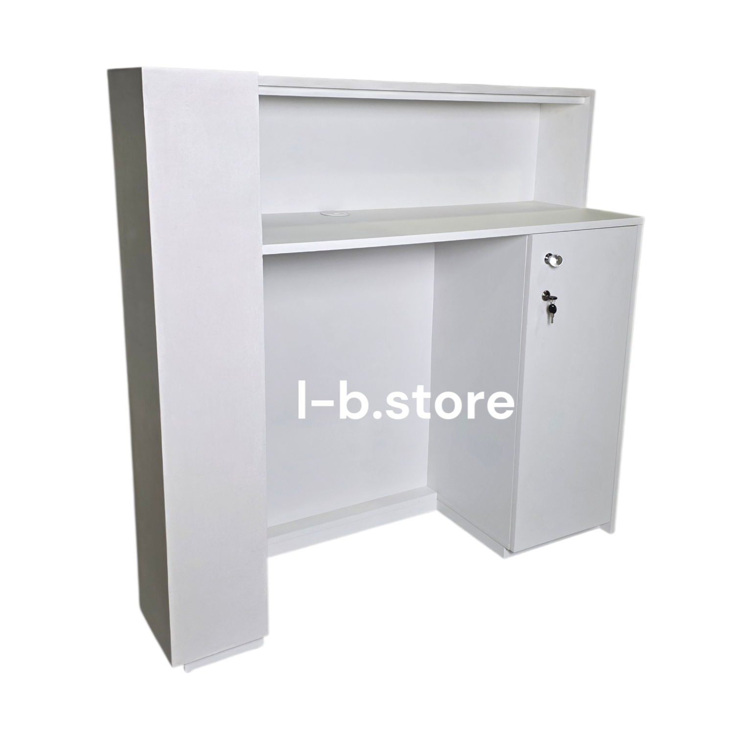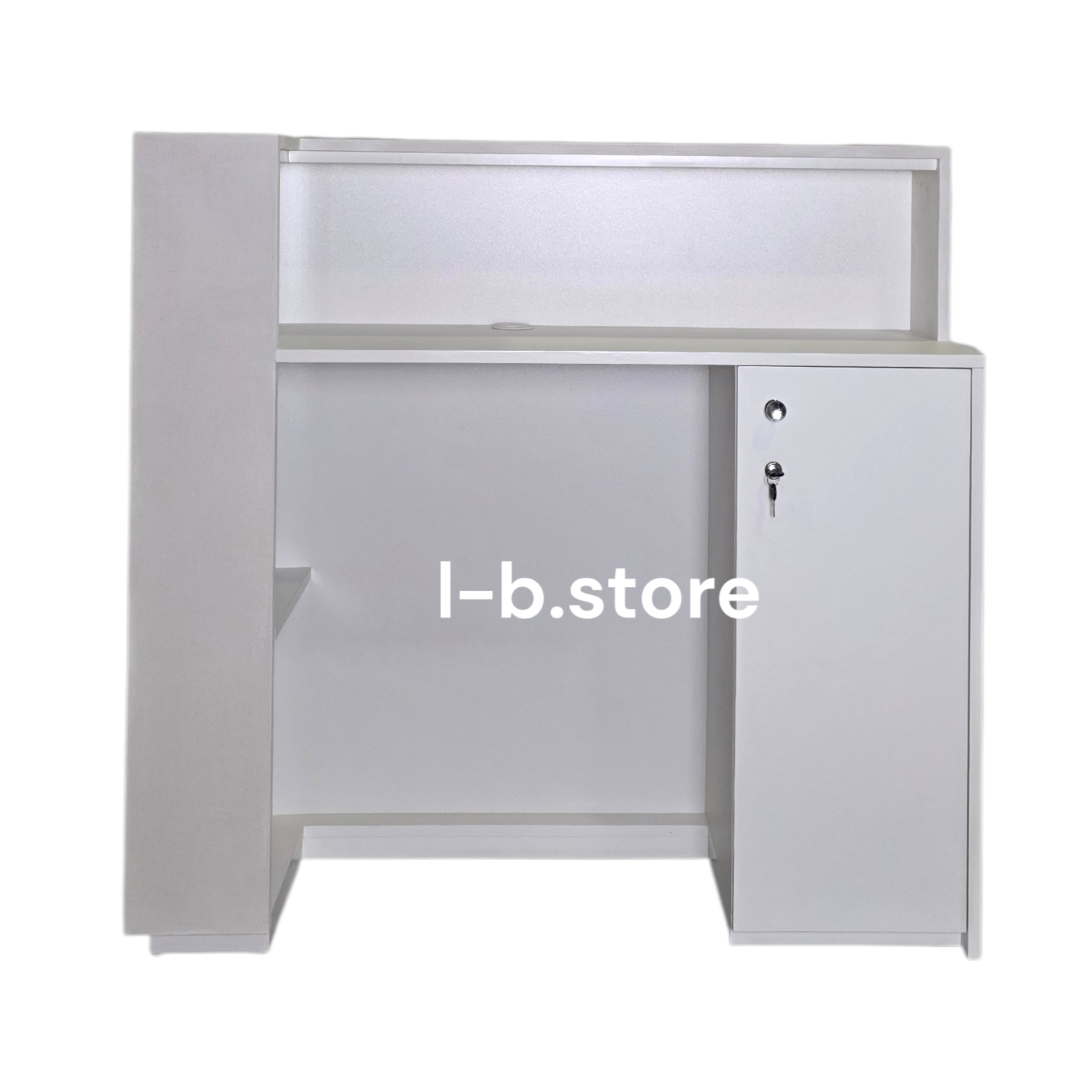 Górny blat wykonany jest w wersji wpuszczonej, dzięki czemu blat oraz powierzchnia frontu tworzą jedną spójną, harmonijną całość. Rozwiązanie to podkreśla architektoniczny charakter recepcji i nadaje jej czystą, minimalistyczną linię.